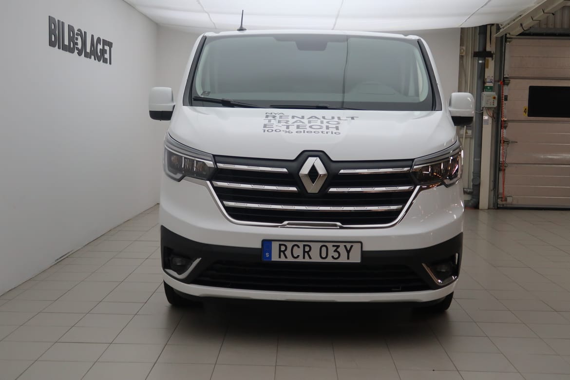 Detta är en fabriksny bil som vi nyligen fått hem. Ett utmärkt val för dig som vill ha en sprillans ny bil utan att behöva vänta på långa leveranstider. Välkommen in och kika på den idag! Har du några frågor om bilen hjälper våra säljare dig gärna. Vi erbjuder trygg finansiering, bra försäkringar samt drivmedelskort med rabatt och bonus. Dessutom är vi auktoriserad verkstad och har däckhotell. Allt du och din nya pärla behöver under ett och samma tak alltså. Renault Trafic E-TECH Van är den perfekta skåpbilen för dig som behöver en pålitlig och rymlig arbetsbil med eldrift. Med sin automatiska växellåda gör den varje körning både smidig och bekväm – oavsett om du kör i staden eller på motorvägen. Eldriften innebär att du får en tystare och mer ekonomisk körupplevelse, samtidigt som du bidrar till en hållbar framtid. Skatten på endast 360 kr per år är ytterligare en stor fördel. Den 8-tums Easy Link-skärmen med DAB+ och smartphone-spegling gör att du alltid är uppkopplad och kan njuta av modern teknik under arbetsdagen. Förarassistanspaketet och dödavinkelvarnaren ger extra trygghet, särskilt vid manövrering i trånga utrymmen eller vid körning i stadstrafik. Parkeringssensorer fram, bak och på sidorna tillsammans med en backkamera gör det enkelt att parkera och undvika hinder. Skåpbilen är också praktisk med sitt generösa lastutrymme, komplett med förvaringsutrymmen under passagerarbänken, plåtvägg och golvinklädnad. Dragkroken med 13-polig kontakt gör det enkelt att ta med släpet på arbetsdagen. Dessutom är karossens design stilren med karossfärgade stötfångare, speglar och ljusramp, vilket ger bilen ett modernt och professionellt utseende. Att köpa en helt ny bil som denna ger dig fördelen av den senaste tekniken, en fräsch inredning och inga tidigare ägare.